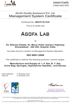 The process is systematic and fully documented, involving trained personnel and most advanced tools and equipments. Under aegis of ISO (International Organization for Standardization) we have successfully installed and implemented a quality management system and are accredited by Zenith Quality Assessors Pvt Ltd. Quality Management System accredited by by Zenith Quality Assessors Pvt Ltd for ISO9001 : 2008 and ISO 13485 : 2003 and CE certification from ITC of Zilin, Czech Republic. All products at Agofa are manufactured as per ISO Quality System. |